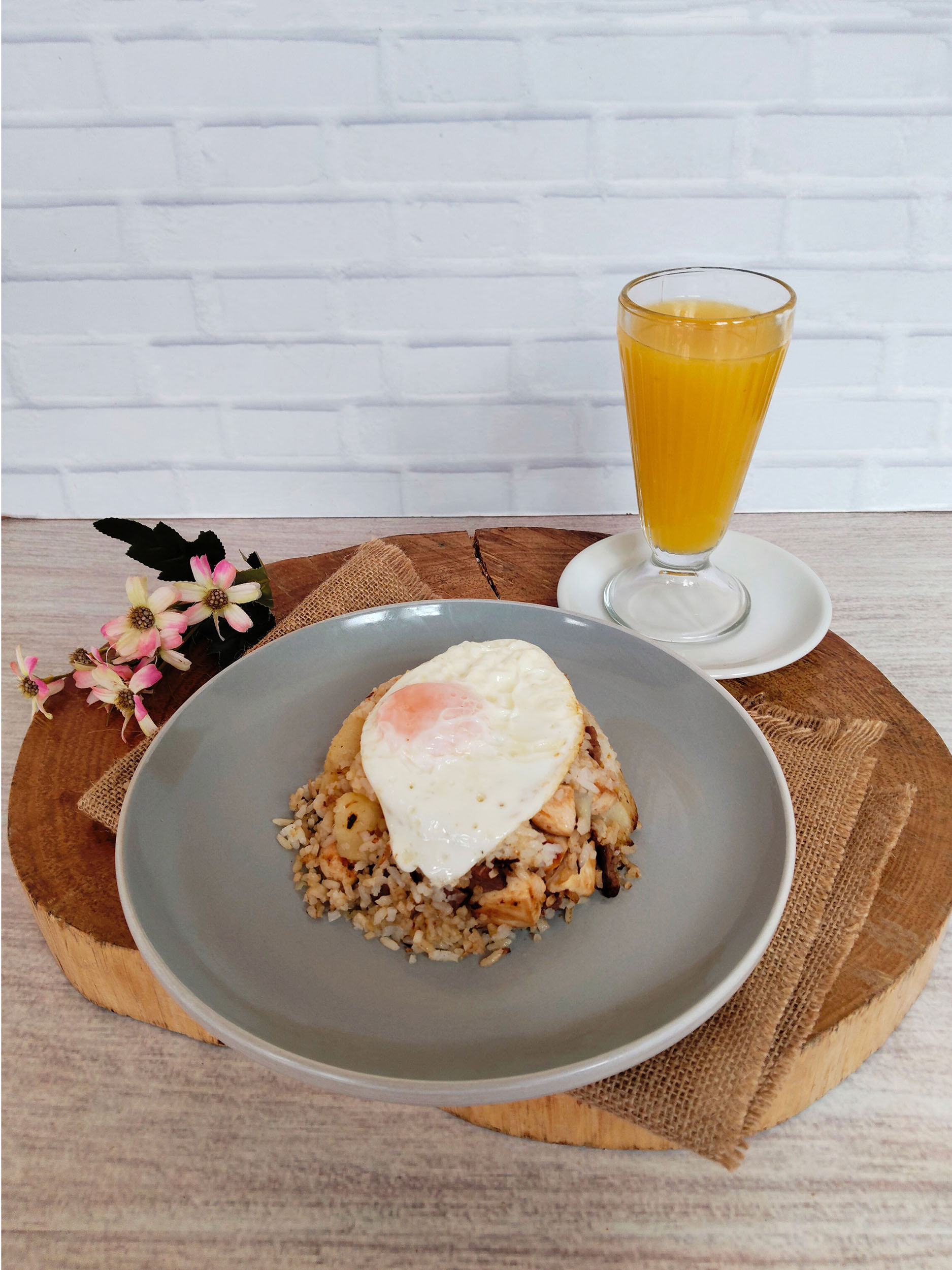 Calentado de arroz, papa, carne y pechuga, huevo frito, bebida caliente o jugo del día de 9 onzas.
